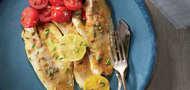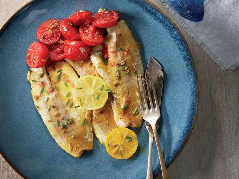- Ayrı bir kasede kekik tohumunu, tuzu, zerdeçalı ve zeytinyağını karıştırın. Bu karışımı tavanın içindeki malzemelerin üzerine dökün. En son dilimlenmiş limonları filetoların üzerine yerleştirin. Orta ateşte 15 dakika pişirin. Ocaktan alın, ince kıyılmış frenk soğanı serpip hemen servis yapın.
