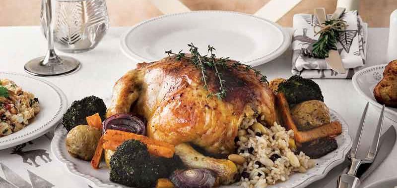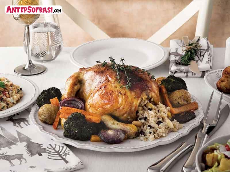 - Önceden ısıtılmış 200 derece fırında, 20 dakika pişirin. Tavuğu büyük bir servis tabağına alın, İç pilavı dilerseniz içine doldurun, dilerseniz servis tabağının kenarlarına yerleştirin. Garnitürlerle tavuğu süsleyin.