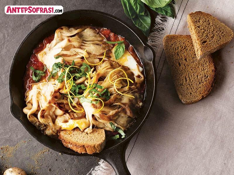 - Domatesler sos kıvamına gelince dilimlenmiş hellim peynirlerini aralarda boşluk kalacak şekilde yerleştirin. Peynirlerin üzerine de ızgara yaptığınız istiridye mantarlarını ekleyin.