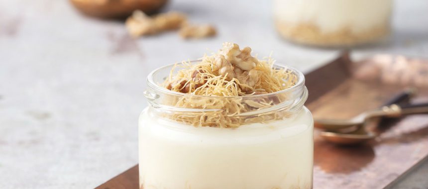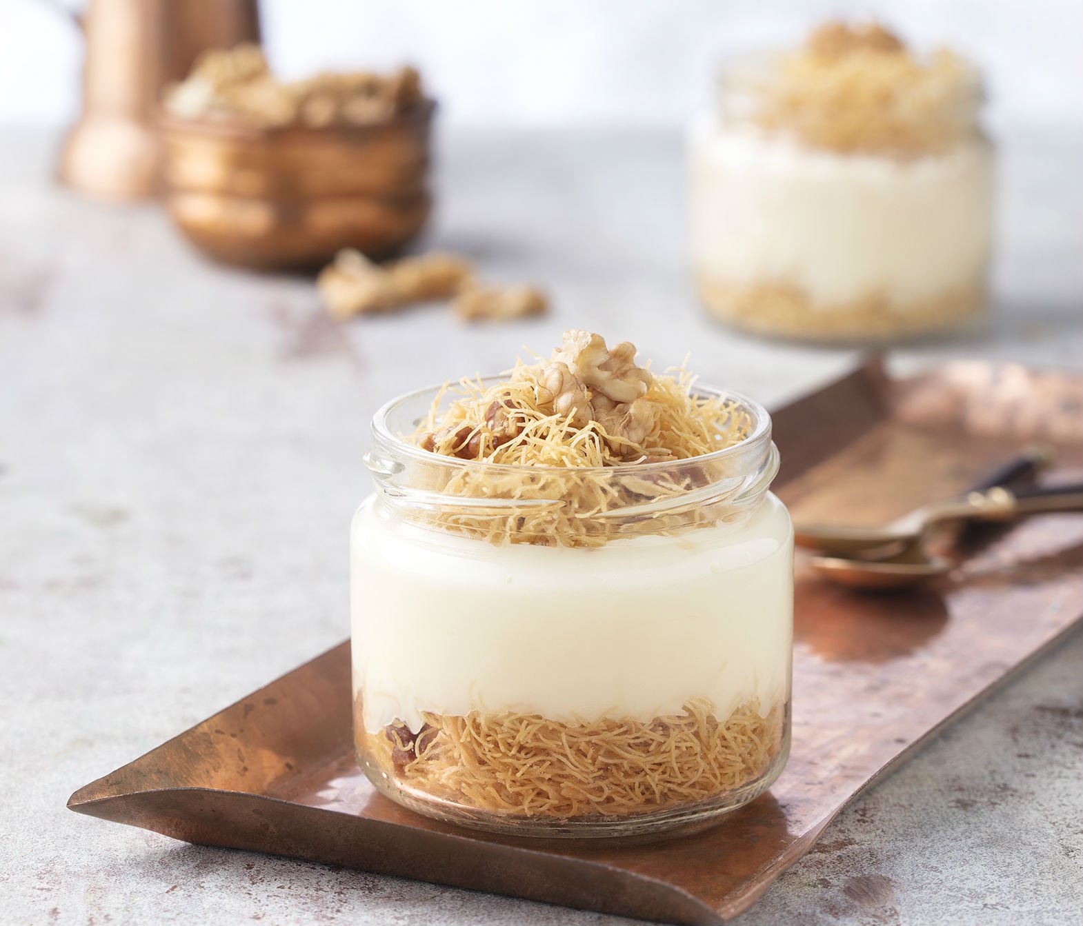 Ürün paketinden çıkan tel kadayıfları bir kaseye alın, cevizi ilave edin ve karıştırın. Hazırladığınız muhallebiyi, aralara ve üzerlerine cevizli kadayıf koyarak kuplara doldurun. Oda sıcaklığına gelince buzdolabına alın ve 1-2 saat bekletin. Arzuya göre hurma ile süsleyerek servis yapın.