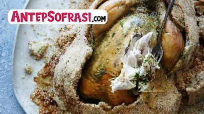 - tavuğun karnını iğne ve iplik yardımı ile dikin. diğer tarafta kasenin içine 1 kg tuzu alın. içine 1 yumurta akı ve biraz su koyarak elinizle iyice karıştırıp köpürtün.