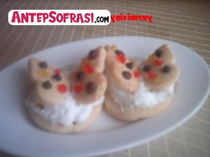 - Yuvarlak kurabiyelerin üzerine krem şantiyi bir bardak süt ile çırpıp hazırlayalım ve üzerlerine 1 kaşık koyalım .