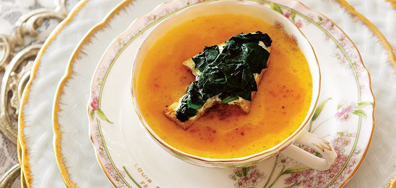 - Erittiğiniz sadeyağın (veya tereyağı) içine kırmızı toz biberi katın ve çorbanın üzerinde gezdirin. Çorbanızı hazırladığınız çam ağaçları ile süsleyerek servis edin. Afiyet olsun.
