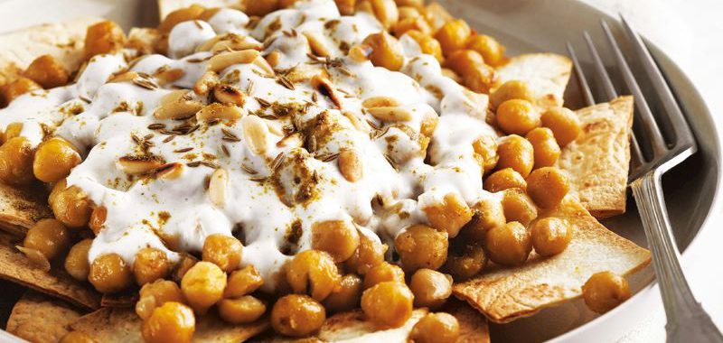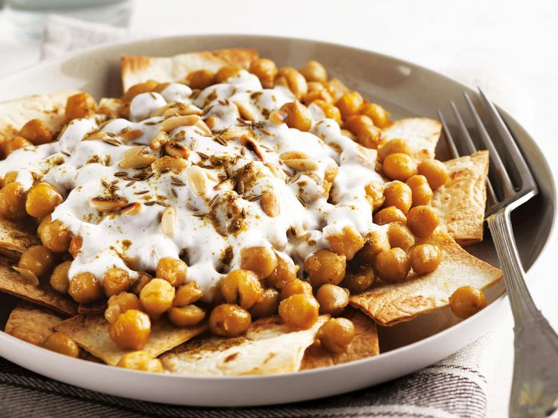 Haşlanmış nohut ve yemeklik doğradığınız soğanı zeytinyağında kavurun. Sebzeli çeşni ve tuz ile tatlandırıp ocaktan alın. Lavaş ekmeğini kare dilimleyip önceden ısıtılmış 180 derece fırında kızarana kadar pişirin. Kızaran lavaşları bir servis tabağına alıp üzerine nohutlu karışımdan ilave edin. Yoğurdu ayrı bir kasede çırpın. Ezilmiş sarımsağı ekleyip karıştırın ve nohutların üzerine gezdirin. Dolmalık fıstık ve kimyonla süsleyerek servis yapın.