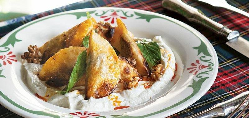 - Her yufkanın ortasına dolgu koyduktan sonra hafifçe parmağınızla ıslatın ve yarım ay şeklinde kapatın.