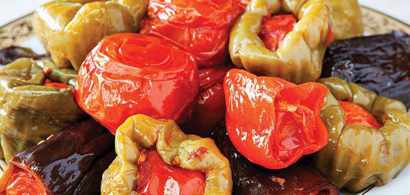 1 Bardak zeytinyağı, domates ve biber salçası, doğranmış soğan ve sarımsaklar, tuz, toz biber ve karabiber pirince eklenerek karıştırılır. Patlıcan ve biberler hazırlanan karışımla doldurulur. Dolmaların ağızları domates parçalarıyla kapatılıp tencereye dizilir ve üzerine ters çevrilmiş bir tabak konur.