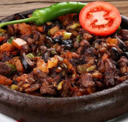 Daha sonra üzerine doğranmış soğanlar da ilave ederek biraz daha kavrulur. Bu arada etlerin üzerine domates salçası eklenip karıştırılır.
