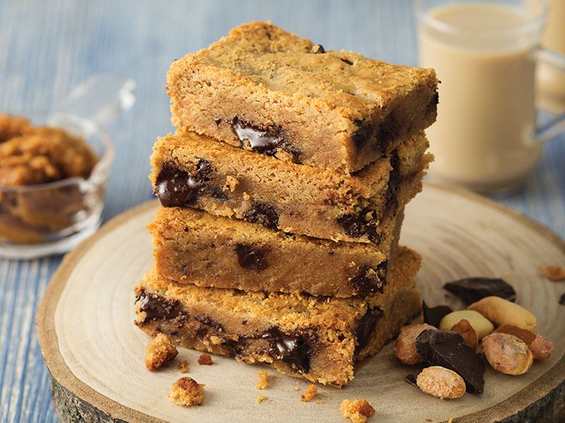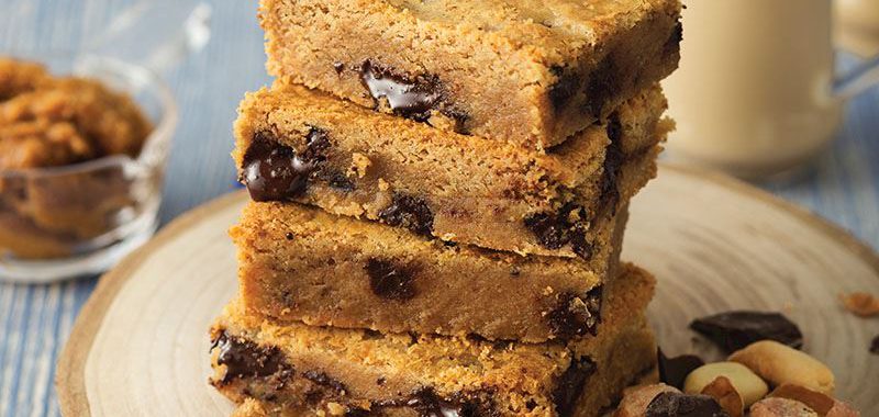 Bir kaseye eritip soğuttuğunuz tereyağını, yumurtayı, fıstık ezmesini, esmer şekeri ve vanilyayı ekleyerek karıştırın. Unu ilave edip karıştırmaya devam edin. İri parçalanmış bitter çikolatayı ekleyin. Karışımı yağlı kağıt serili bir tepsiye yayın. Önceden ısıtılmış 180 derece fırında yaklaşık 20-25 dakika pişirin. Fırından çıkartıp soğumaya bırakın. Kare parçalar keserek servis yapın.