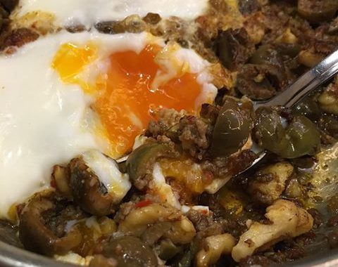 Çevrilen yeşil zeytinler, tavanın içinde göz göz ayrılır. Yumurtanın sayısına göre bölünür. Bölünen gözlerin her birine bir tane yumurta kırılır ve hafif sallayarak karıştırılmadan pişirilir.