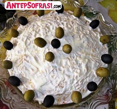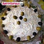 - Salatayı servis tabağına alıp üzerini zeytinlerle süsleyin.