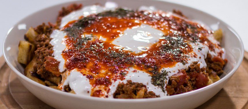 Islanmış pideler servis tabağına dizilir; üzerine sarımsaklı süzme ypğurt gezdirilir. Kavrulan kıyma üzerine gezdirilir ve 1 dal maydanoz ile süslenir.
