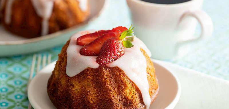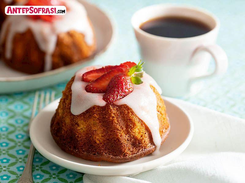 - Hamuru yağlanmış yuvarlak ve ortası delik kek kalıbına veya küçük kek kalıplarına dökün. Önceden ısıtılmış 175 derece fırında 50-55 dakika pişirin (Kalıplar küçük ise pişme süresi daha kısa olacaktır). Fırından alın, 10 dakika sonra servis tabağına ters çevirerek yerleştirin.
