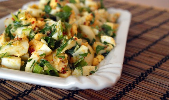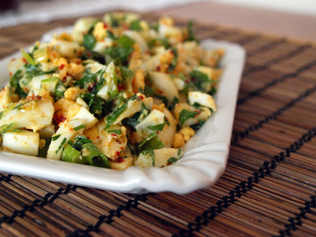 Yumurtalar haşlanır, kabukları soyulur ve ufak ufak doğranır. Taze soğanlar soyulur, yıkanır ve ince ince doğranıp bir tarafa konur, maydanozlar ayıklanır, yıkanır, ince ince kıyılır.