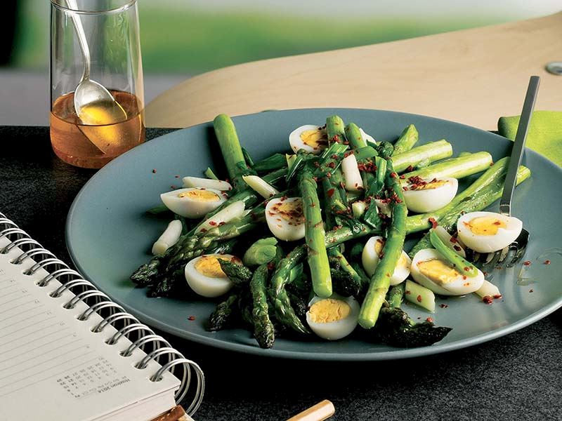 - Kuşkonmazları ve taze soğanları bir servis tabağına alın.