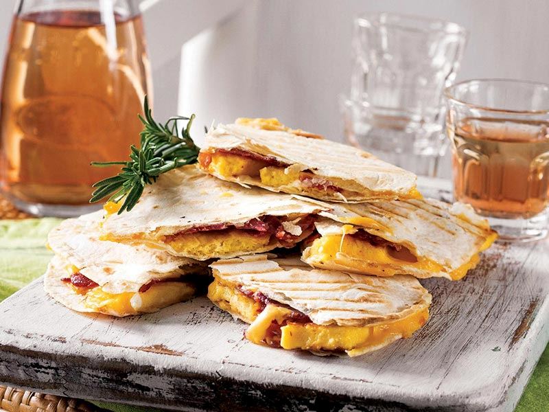 - Dört tortilla ekmeğine sırasıyla çedar peyniri, omlet, doğradığınız pastırma ve tekrar çedar peyniri ekleyin. Üzerlerine kalan tortilla ekmeklerini kapatın. Tost makinesinde peynirler eriyene kadar arkalı önlü kızartın. Dilimleyerek servis yapın.