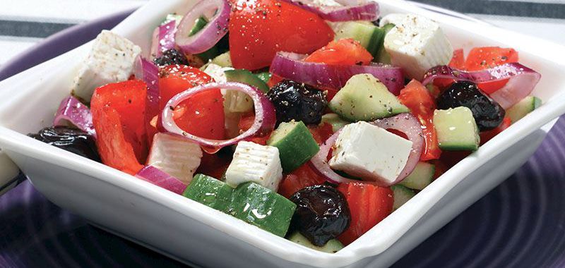 Kalay hazırlanabilen Yunan usulu salta. Domates ve salatalıkları yıkayıp kabuğuyla iri küp şeklinde doğrayın. Zeytini bıçakla kesip içinden çekirdeklerini çıkartın. Soğanın kabuğunu soyup halka şeklinde doğrayın. Hepsini bir kaseye alıp harmanlayın. Peyniri küp şeklinde doğrayıp ekleyin.